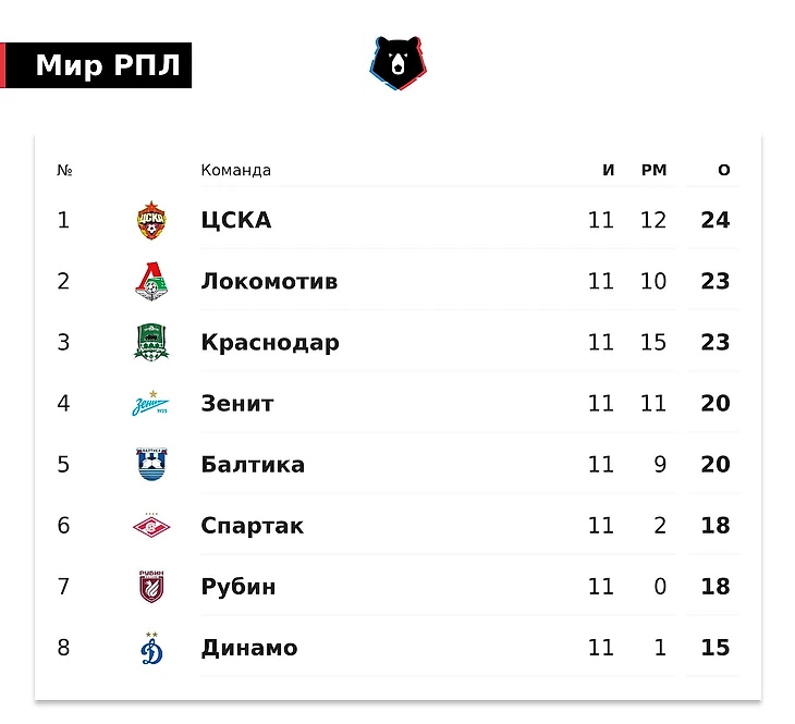 ЦСКА лидирует в РПЛ после 11 туров с 24 очками. «Локомотив» – 2-й, «Краснодар» – 3-й, «Зенит» – 4-й, «Спартак» – 6-й, «Динамо» – 8-е