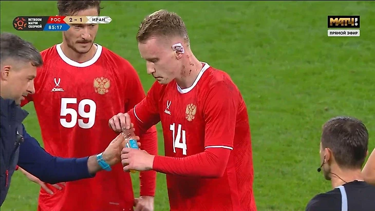 Защитник сборной России в конце второго тайма BetBoom товарищеского матча со сборной Ирана во время борьбы за верховой мяч получил удар шипами в область головы от Алирезы Джаханбахша.