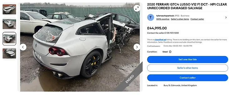 Как сообщает The Sun, изначально Ferrari Lusso стоил 260 000 фунтов. Сейчас на eBay поврежденное транспортное средство продается за 44 995 фунтов.