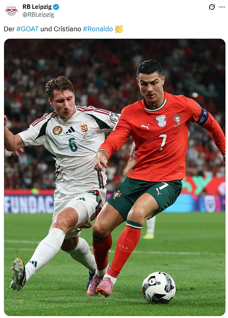 «GOAT и Роналду». «Лейпциг» выложил фото Орбана и Криштиану с матча Португалии и Венгрии