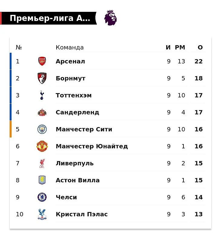 «Арсенал» лидирует в АПЛ после 9-го тура. «Борнмут» – 2-й, «Тоттенхэм» – 3-й, «Ман Сити» – 5-й, «МЮ» – 6-й, «Ливерпуль» – 7-й, «Челси» – 9-й