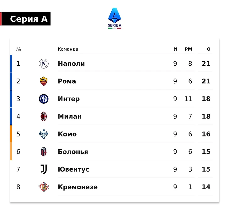 «Интер» и «Милан» набрали по 18 баллов, «Комо» – 16, «Болонья» и «Ювентус» – по 15. Три последние строчки на данный момент у «Дженоа» (3 очка), «Фиорентины» (4) и «Пизы» (4 после 8 игр).