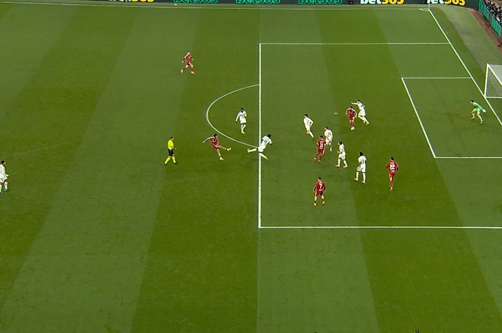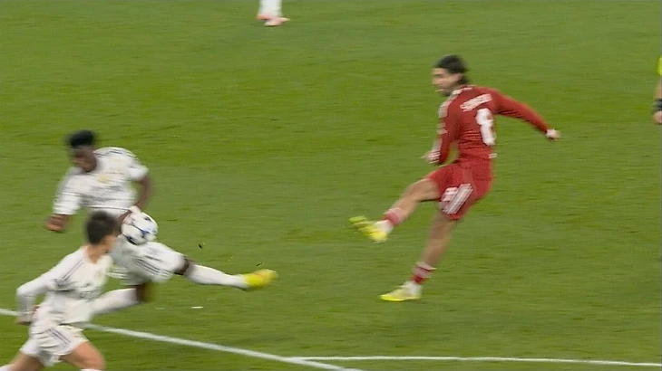 • Мяч на границе штрафной «Реала» попал в руку Тчуамени. Судья Ковач назначил штрафной удар, пошел смотреть повтор на предмет пенальти и отменил фол