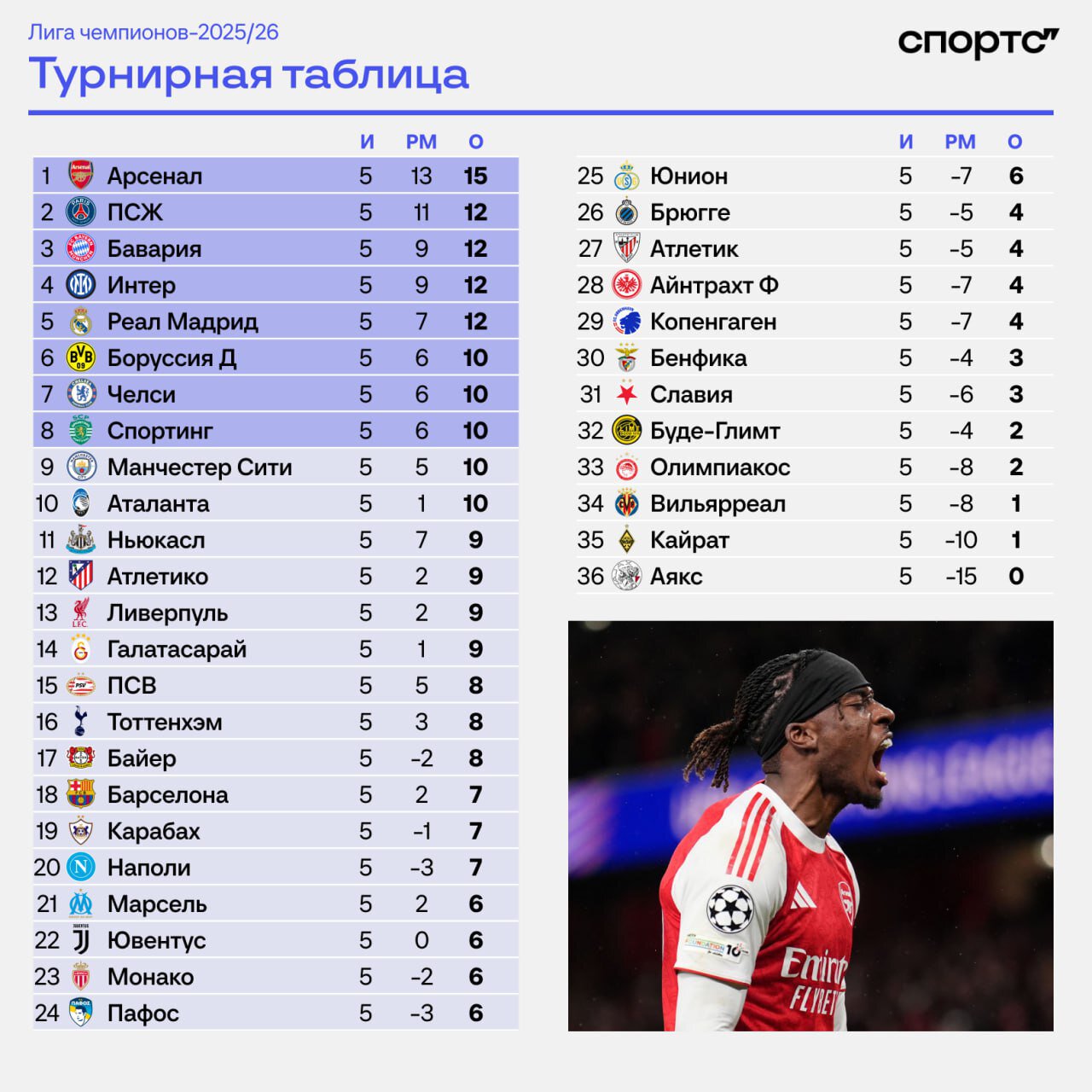«Арсенал» лидирует в ЛЧ после 5 туров, «ПСЖ», «Бавария», «Интер» и «Реал» – в топ-5, «Ман Сити» – 9-й, «Ливерпуль» – 13-й, «Барса» – 18-я, «Ювентус» – 22-й, «Кайрат» – 35-й