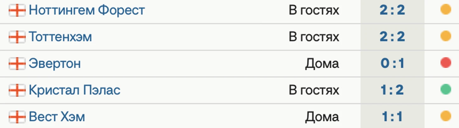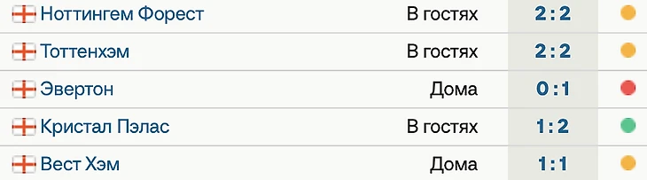 У команды Рубена Аморима 1 победа в 5 последних матчах чемпионата Англии, 3 ничьих и одно поражение.