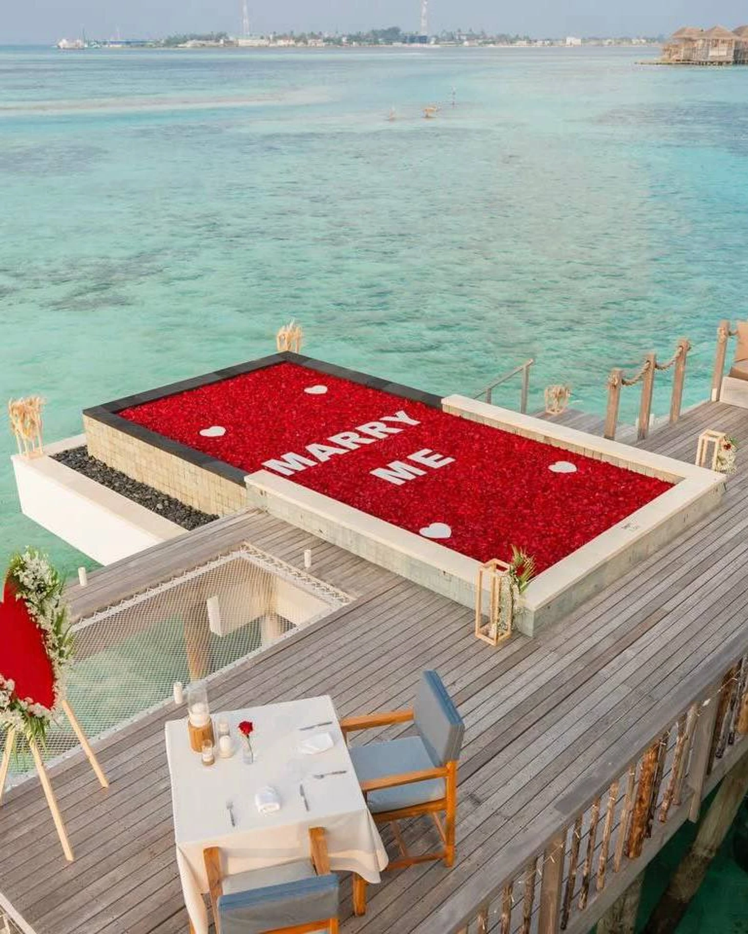 На снимках пара прогуливается по пляжу, а также виден бассейн, засыпанный лепестками красных роз с надписью: «Выходи за меня» и сердечками.