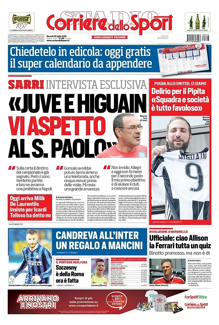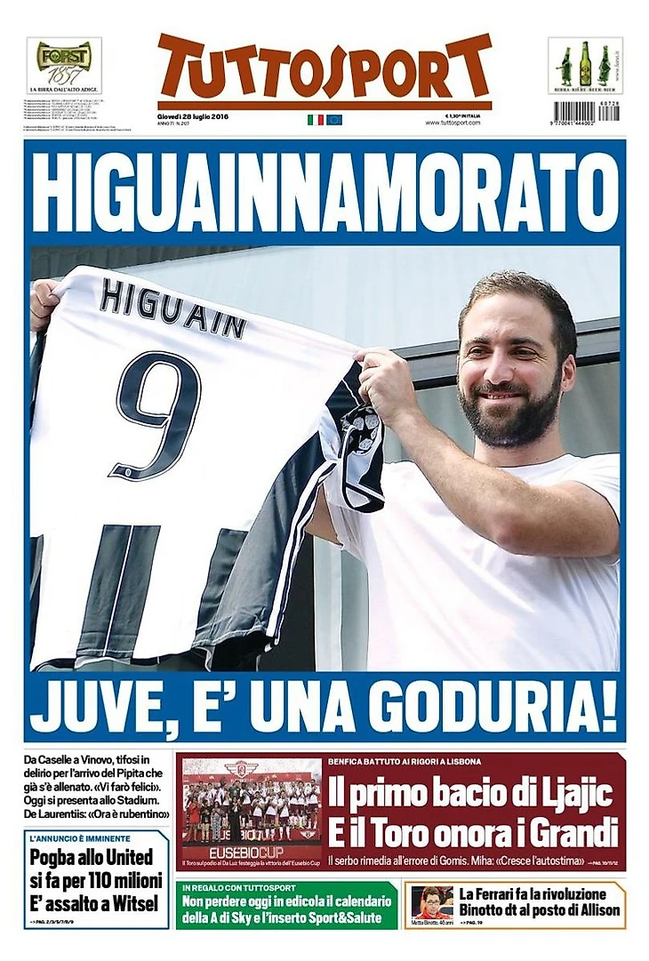 Игуаин и прибытие в Турин как король. Послушайте Вальдано: «Хорошо, «Юве», нет никого, как он». Аргентинская легенда коронует новичка Бьянконери. Гонсало: «Надеюсь делать великие дела». Яд от Де Лаурентиса: «Теперь он тюремщик». И Погба видит «Юнайтед»: Аньелли получит 110 миллионов.