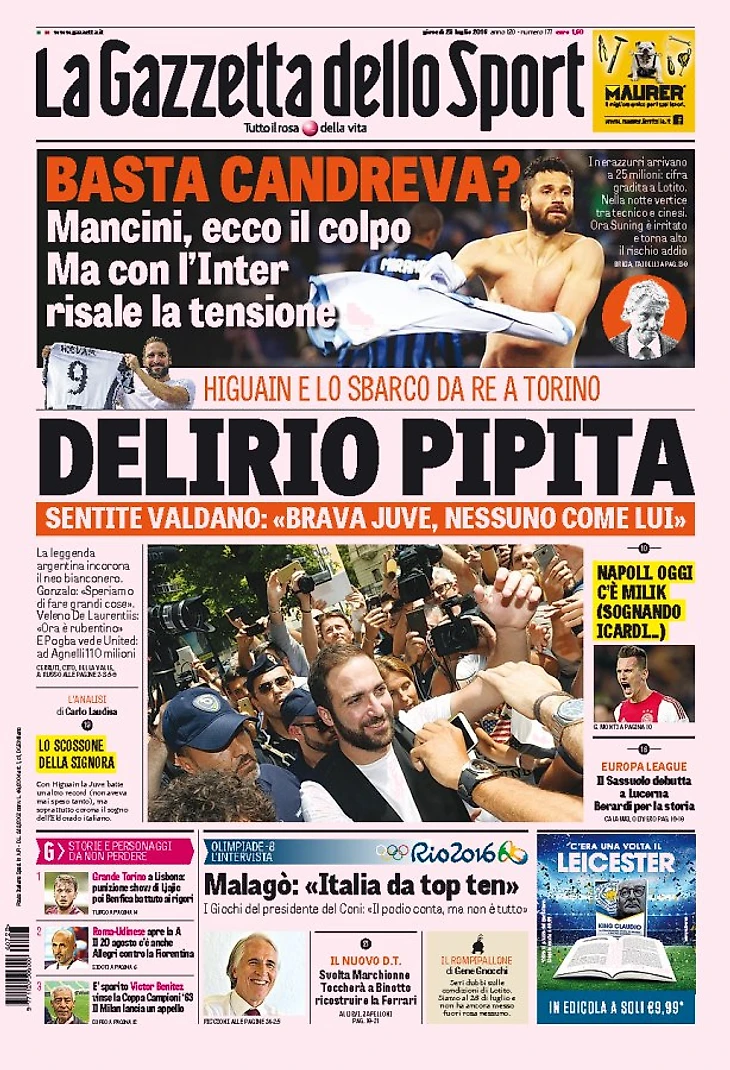 «Лихорадка Игуаина». Заголовки Gazzetta, TuttoSport и Corriere за 28 июля
