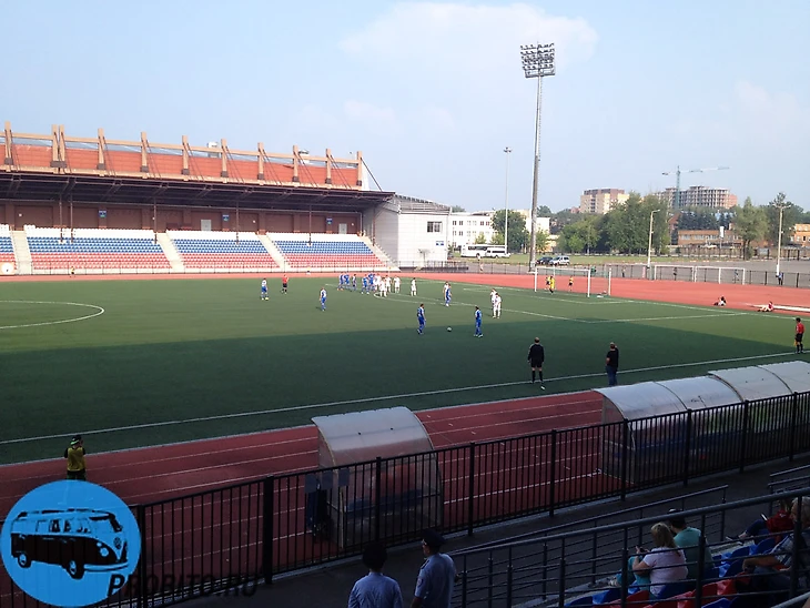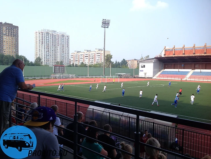 На “Салют”, где проходила встреча, мы прибыли минут за пятнадцать до начала. Ажиотажа у стен стадика особенно не наблюдалось. Народ, минуя одиноко стоящий ларек с атрибутикой, продавливал турникеты словноТ-1000 из всем известного фильма “Терминатор-2: Судный день”, и не спеша размещался на западной трибуне, которая к 16:00 была защищена тенью. Запад, собравший по протоколу 1000 зрителей, является частью ФОК “Салют”, и внутри трибуны расположены различные спортивные залы. В целом, проект стадиона оказался вполне стандартными для Московской области и напомнил современный спортивный объект в Домодедово (ссылка). Восточная трибуна выполнена по схожему сценарию: с трибуны вы можете прямиком попасть в помещение спортивного объекта для indoor-соревнований.