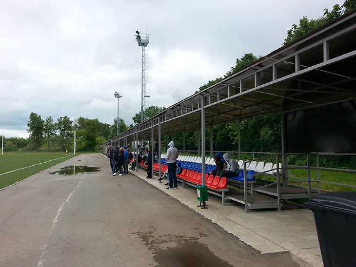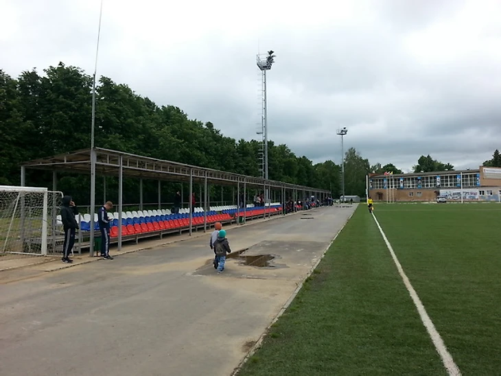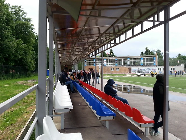 От остановки до стадиона идти минут десять. Село Непецино, на первый взгляд, утопает в благополучии. Стадион очень простенький, но достойный, а для сельского уровня – просто идеальный. Искусственное поле, трибуна человек примерно на 500, между трибуной и полем нет сетки, ура (обычно на подмосковных стадионах она есть). Трибуна тянется вдоль всего поля, но она сама по себе очень маленькая – всего в три ряда кресел. И, как нетрудно догадаться, верхний ряд белый, средний синий, а нижний красный. Никак не могут российские стадионостроители отойти от этого железобетонного (вернее, пластикового) решения.