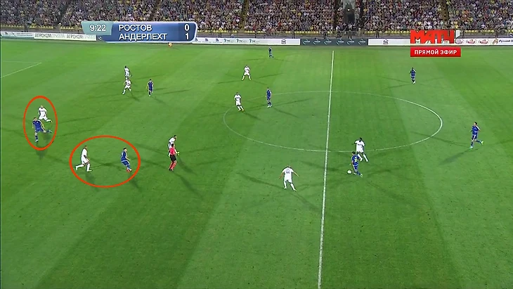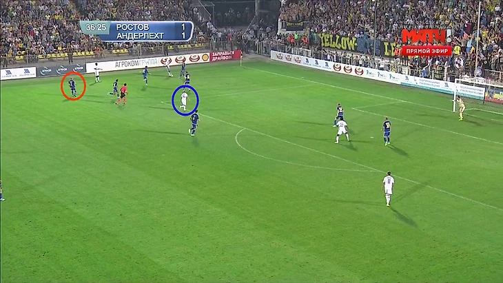 Пожалуй, единственная позиция, на которой возможны варианты — это позиция центрального нападающего. Бердыев предпочел выпустить в старте Бухарова, а не Азмуна, и в целом этот ход себя оправдал. «Андерлехт» отказался от прессинга центральных защитников «Ростова», и сосредоточился на перекрытии пространства в центре поля. При этом опорник гостей Дендонкер должен был контролировать пространство перед линией защиты. Задача у него была непростая — в эту зону постоянно пытался открыться кто-то из центральных полузащитников «Ростова», поэтому за часто отскакивавшим назад Полозом приходилось далеко уходить одному из центральных защитников. Из-за этой особенностей построения бельгийцев Бухаров часто оказывался один на один с центральным защитником соперника, при этом линия защиты была растянута — крайние защитники не могли сильно сужаться, поскольку это оголило бы фланги. «Ростов» пользовался этим одиночеством Бухарова, забрасывая мячи в его направлении. Один из таких забросов и привел к назначению голевого штрафного.