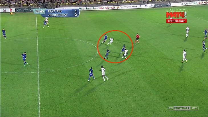 Трое ростовчан накрывают двоих соперников при выходе из обороны. Калачев очень сместился в центр, сейчас подберет мяч и начнет голевую атаку