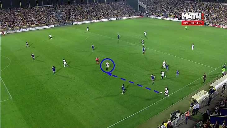 Калачев выдергивается на игрока с мячом и оставляет пустую зону на фланге, куда идет игрок соперника. Баштуш вынужден его страховать и растягивать оборону