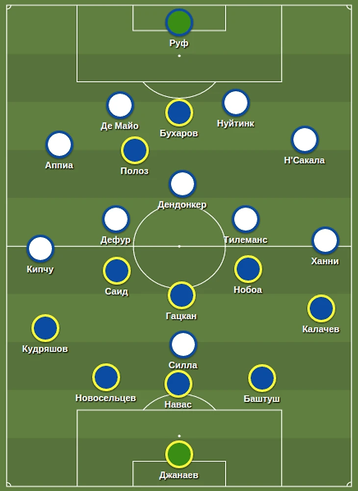 «Ростов» выстроился по привычной схеме 5-3-2, с Калачевым на правом фланге и Саидом в центре поля. Эти две позиции вызывали наибольшие опасения. После потерь в межсезонье Канги и Могилевца у Бердыева практически не осталось вариантов в центре, и на важнейшую позицию пришлось выпускать Саида, до этого почти не игравшего даже в РФПЛ. Калачев же, несмотря на весь свой опыт, больше тяготеет к атаке, и скорее всего Бердыев для лигочемпионского матча предпочел бы более оборонительный вариант. Но вариантов у главного тренера ростовчан практически не было — на правом фланге мог сыграть разве что Денис Терентьев, но его пока как игрока основы для важных матчей Бердыев не рассматривает.