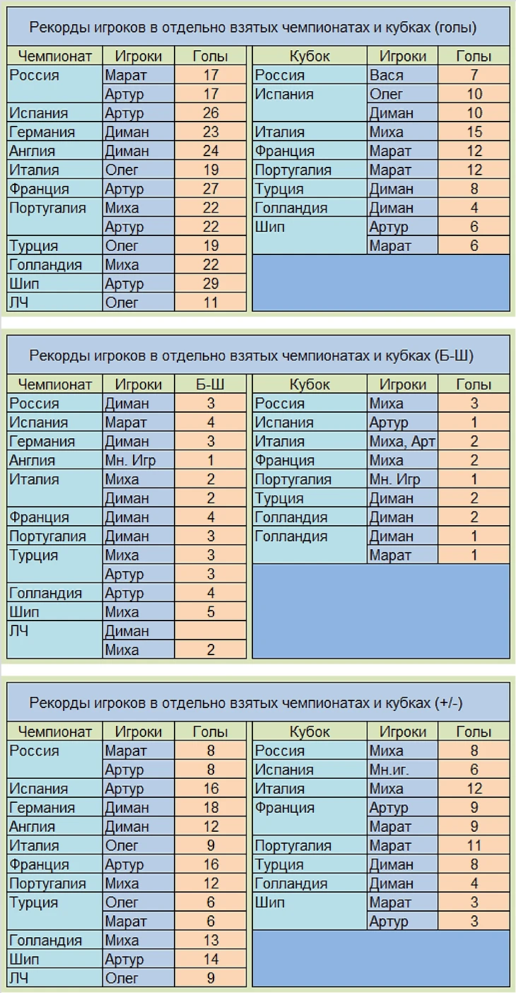 А теперь перейдем к лучшим бомбардирам клуба. Конечно, 2 отца - основателя здесь имеют преимущество перед остальными игроками. В сезоне 2014/15 главным забивалой клуба был Марат, а вот в 2015/16 годах уже Артур проявил свои бомбардирские качества, и теперь этих игроков разделяет всего 1 гол за звание лучшего бомбардира Алнаса (все турниры). Так же эти парни никак не могут решить, кто же будет лучшим бомбардиром РФПЛ (в ходе одного сезона). Но и пришедшие игроки не стали сидеть на попе ровно, а сразу взяли быка за рога. И если Артуру удалось сохранить свои позиции и улучшить клубный рекорд в чемпионатах Франции и Испании, то вот Марата в ЧГ и АПЛ подвинул Дмитрий, а в Италии Олег. Но видать Марат больше сосредоточился на кубках. В целом, пока пятеро игроков вписали свои имена в книгу клубных рекордов. Антону и Максиму предстоит выложиться на 200%, чтобы подвинуть кого-нибудь из них. Неплохая мотивация.