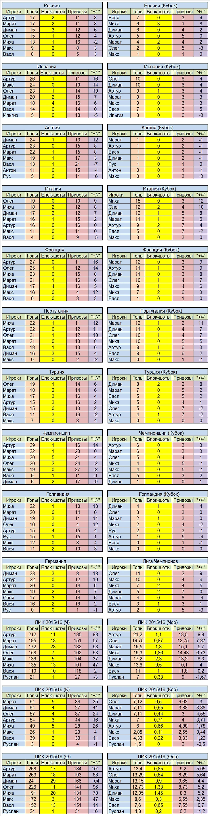 В целом хотелось бы поблагодарить всех игроков за хорошую работу и удачный сезон. Все игроки набрали положительное значение по показателю "+/-" (Руслан, сыграл всего 3 чемпа, и они отражают полную картину его игры), и высоко поднялись в рейтинге 7ми. "Падение" Михаила на один пункт, я связываю лишь с его загруженностью на работе в конце прошлого сезона. Но и соперник у него был не лыком шит. Олег тоже потерял несколько позиций, что скорее всего связано не с его качеством игры, а повышением уровня игры нескольких игроков, в том числе и его одноклубников. Но не всё так гладко. И есть определенные чемпионаты, в которых Алнасу нужно прибавить. Например, в Шипе только 2е игроков вышли в плюс, а Марат сыграл в ноль. Остальные же ушли в минуса. Но и плюсы Михаила в виде 5 блок-шотов должны были подкрепляется голами остальных игроков. В общем, работы здесь непочатый край. Единственные чемпионаты, где все игроки команды вышли в плюс, были чемпионаты Голландии и Франции. Так же не очень хорошая статистика по показателю "+/-" у игроков Алнаса в чемпионате Англии. Однако, среди тех кто остался во франшизе, только Антон имеет отрицательное значение "+/-" (но, Англия сгубила не мало хороших фэнтэзистов в прошлом сезоне), что не может не внушать оптимизма на удачное выступление команды в будущем сезоне. Британия, мы идем! В остальных же чемпионатах игроки выступали довольно ровно, и лишь один из 7 членов команды имел незначительный минус. В итоге, как показал прошлый сезон, если средний показатель "+/-" по всем чемпионатам будет близким к 9ке у большинства игроков, то мы соберем неплохой медальный урожай. Но и стремиться к 10ке никто не мешает. По кубку же этот показатель желательно приблизить к 5 и даже выше. Особенно это касается вашего ГМ, для которого кубковые матчи являются ахиллесовой пятой.