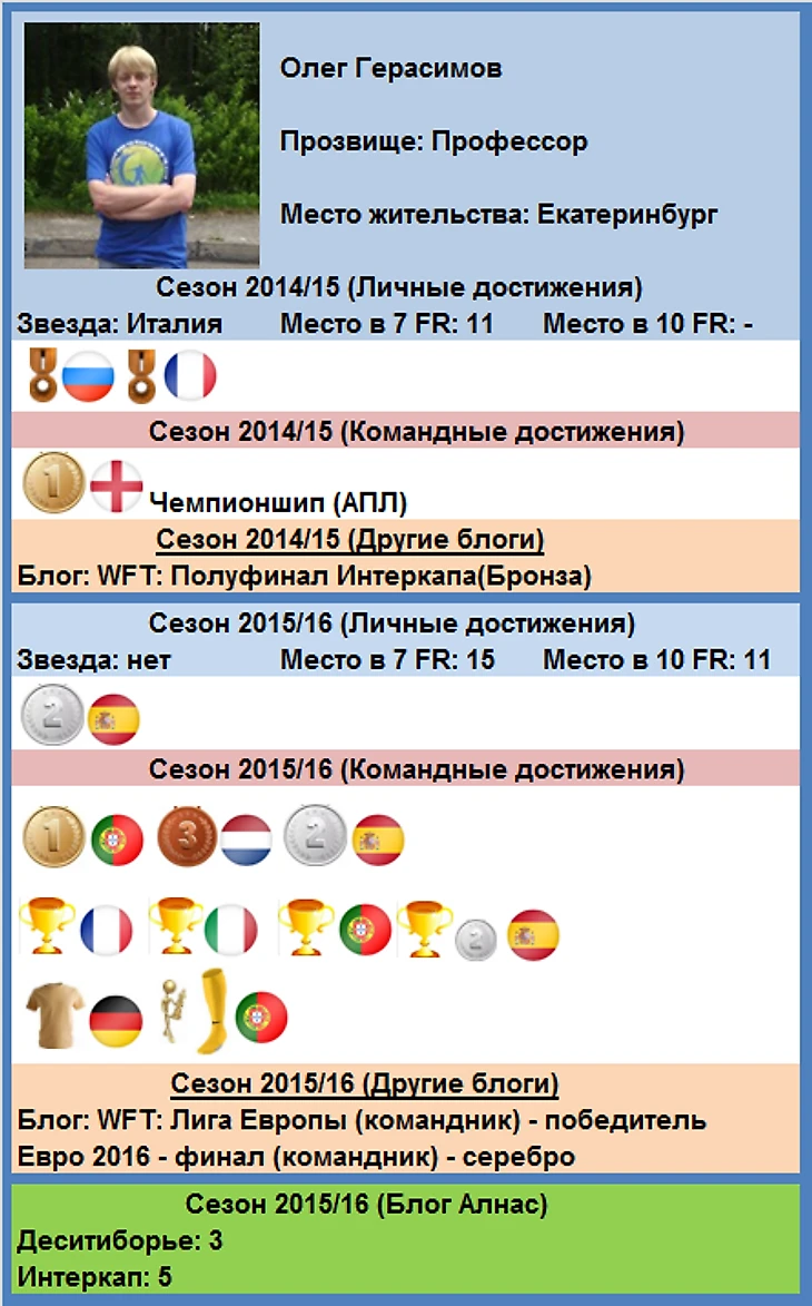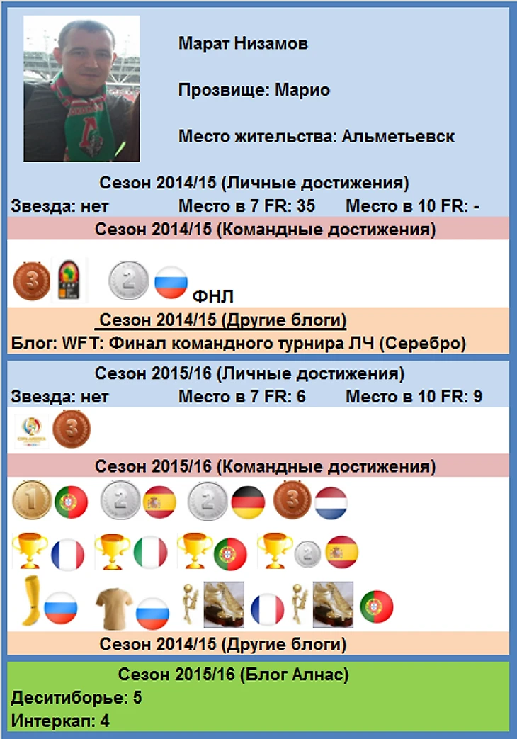 Перед началом сезона я решил обновить личные карточки игроков, а так же собрал определенную статическую информацию о игроках клуба с момента его основания. Здесь мы можем увидеть, как выступали игроки Алнаса в прошлом и позапрошлом сезоне, узнать имена лучших бомбардиров кубков и чемпионатов различных стран, а так же обладателей клубных рекордов. В общем, здесь много чего интересного. А так как Михаил (7), Олег (8) и Руслан (3) играли не во всех чемпионатах, я решил вести среднее значение в отдельных таблицах. Игроки, сыгравшие с Алнасом только один чемпионат, не попали в итоговую сводку. Данную статистику я буду подводить по итогам каждого сезона, и каждый сможет посмотреть, как он выступал по сравнению с прошлым годом.
