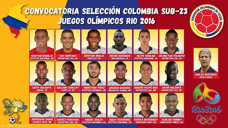 В Рио сборная Колумбии в пятый раз сыграет в мужском олимпийском футбольном турнире. Страна в очередной раз надеется выступить удачно. Четыре предыдущих выступления (Мехико 1968, Мюнхен 1972, Москва 1980 и Барселона 1992) сопровождались неизменно высокими ожиданиями. На игры ездили отличные поколения колумбийских футболистов, но надежды не оправдались ни разу. Команда каждый раз проваливалась и вылетала на первой же стадии турнира.