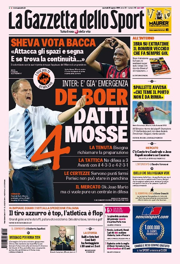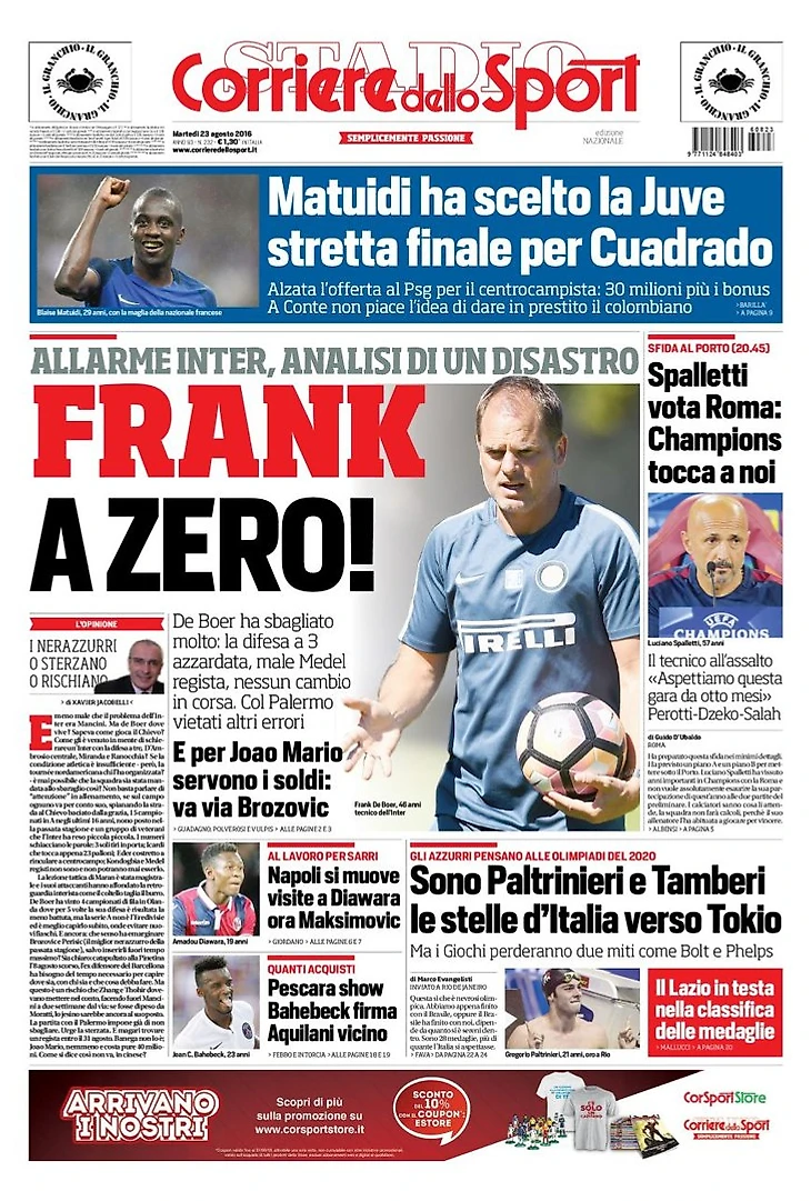 «Франк на нуле!». Заголовки Gazzetta, TuttoSport и Corriere за 23 августа