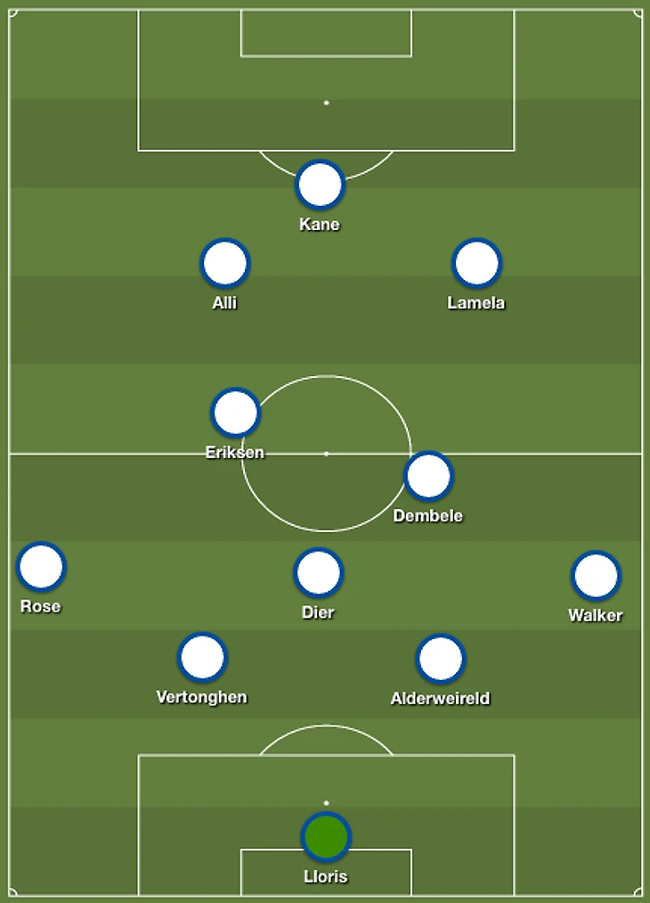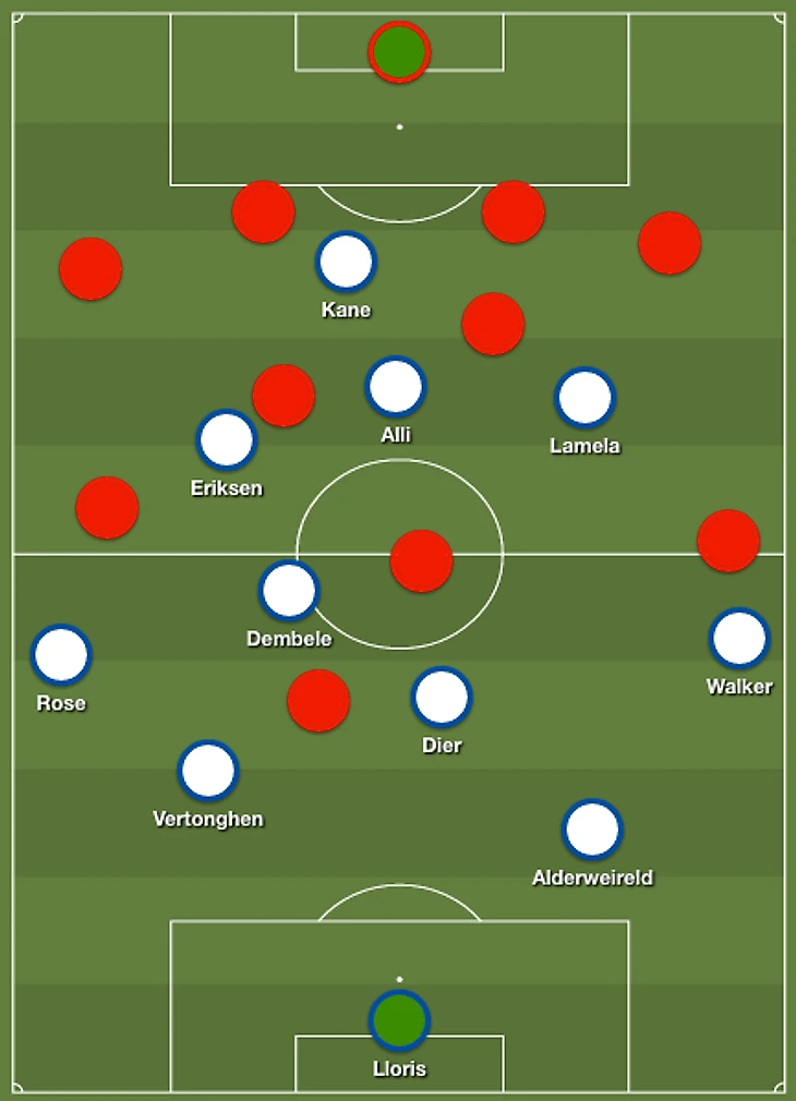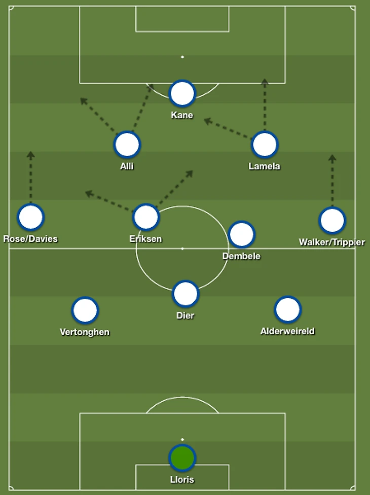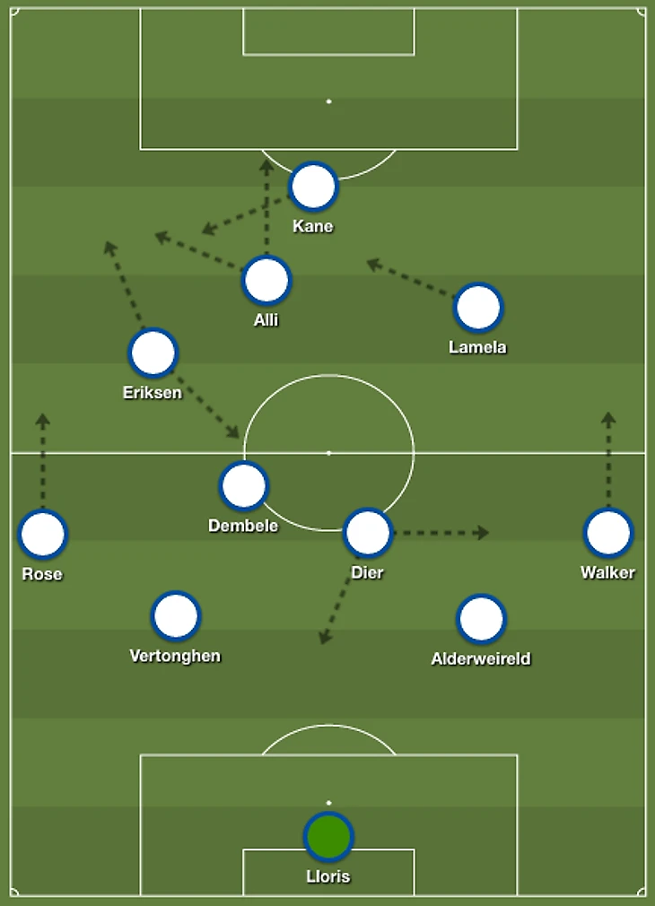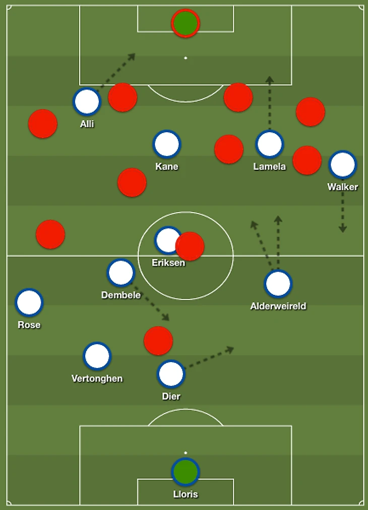 Теперь Алдервейрелд может выдвигаться с мячом вперед, а Дайер занимает его место в защите. Уокер и Кейн идут на мяч, предлагая себя для передачи, в то время как Алли может совершить диагональный проход на центральную позицию позади защиты соперника, тогда как Ламела - стартовать по правому коридору.