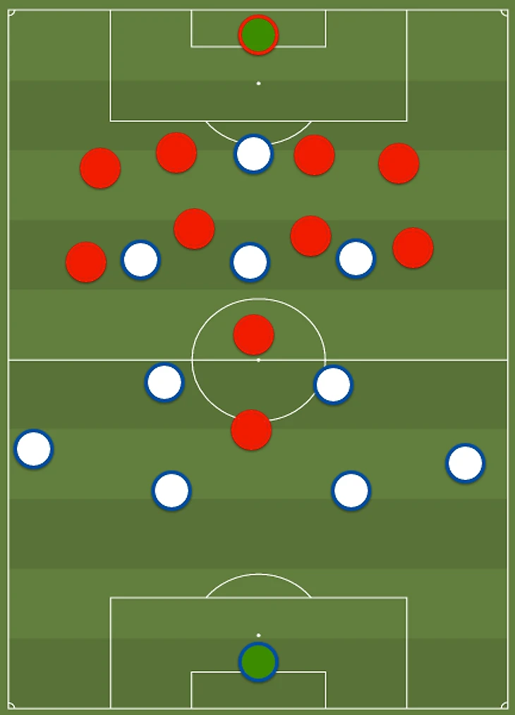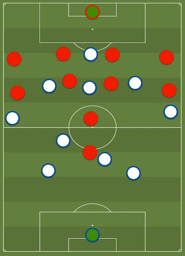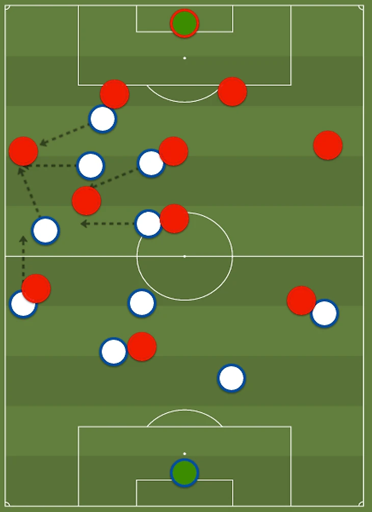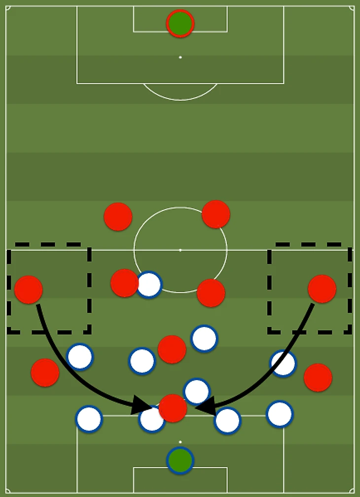 Но Почеттино заставляет своих вингеров (у которых рабочая нога "обращена" внутрь поля) действовать узко и по центру, а "номер десять" играет чуть ниже, чтобы формировать атакующее трио из центра поля, при этом меняясь позициями друг с другом - "перегрузка центра".
