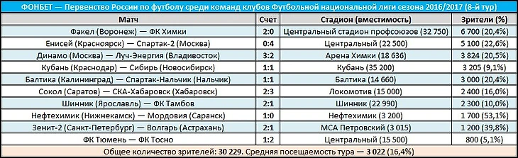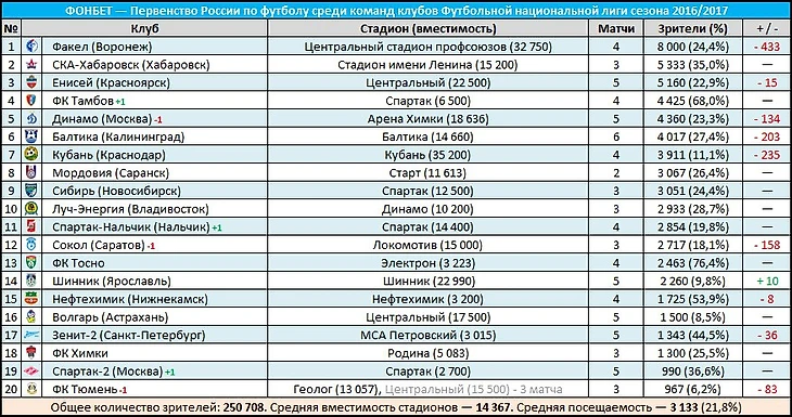 Как и ожидалось, матчи Факела и Енисея стали самыми посещаемыми в 8-м туре ФНЛ. Но если Воронеж порадовал публику, то Красноярск вновь стал свидетелем фиаско. В последних 12 матчах ФНЛ на Центральном стадионе Енисей забил всего 1 мяч и набрал только 2 очка, при этом пропустив в свои ворота свыше 20 голов. Многие болельщики клуба уже называют этот стадион проклятым, но, несмотря на это, продолжают ходить на него гораздо активнее, чем в прошлом сезоне. Тогда 7 матчей посетили в среднем 2,150 зрителей, сейчас - 5,160 за 5 матчей.