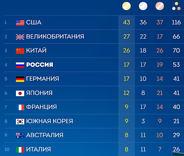 Наверно каждый со мной согласиться, что не пустить половину участников-это было не справедливо! Но так как Америка сейчас по кол-во медалей на 1 месте в списке, а мы 4-ые! Всё равно будем знать что Россия всегда ПЕРВАЯ! Ведь для такого маленького количества участников в Рио, Россия приносит в нашу копилку на данный момент 53 медали! 17 золотых, 17 серебряных и 19 бронзовых.