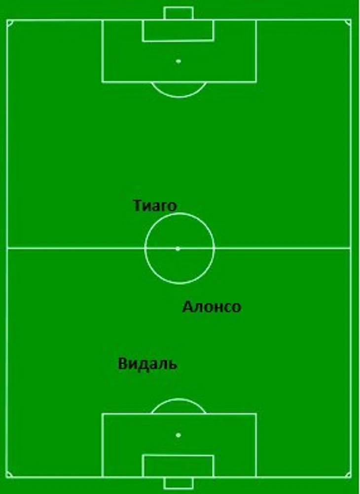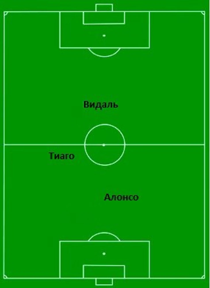 2. Среди особенностей игры "Баварии" стоит отметить гибкий и динамичный центр поля, где "первую скрипку" играл Артуро Видаль. Поначалу чилийский хавбек больше находился на своей половине поля, спускаясь к центральным защитникам, в то время как Хаби Алонсо отвечал за баланс в центре поля, а Тиаго располагался в зоне трекварти (схема 1). К середине первого тайма, когда мюнхенцы уже повели и почувствовали больше свободы в середине поля, Видаль всё чаще стал уходить в атаку, Алонсо расположился глубже и теперь он, обладая неплохим первым пасом, начинал атаки "Баварии". Тиаго же спускался к центральному кругу, где у него было больше возможностей выдать обостряющую верховую передачу (схема 2). Такая гибкость в центре поля серьёзно запутала полузащитников "Вердера", в результате чего они стали допускать грубые позиционные ошибки (очень показателен эпизод, когда Мюллер получил огромное количество пространства перед штрафной, и лишь штанга спасла ворота Видвальда от гола).