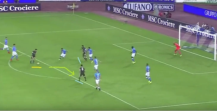 Желтым цветом подмечена позиция Бонавентуры, а голубым - партнеров по атакующей линии, зеленым же - дальнейшее развитие атаки. Особо отметим, что изменение роли игрока - идея Монтеллы. В первом тайме настолько показательных эпизодов не было.