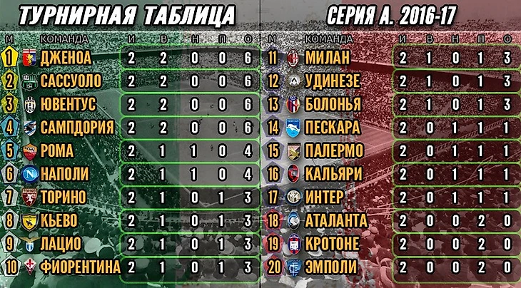 Пока, если верить этой таблице, в футбол лучше всего играют в Лигурии. Однако, если грамотный старт подопечных Юрича был предсказуем, то вот взлет "Сампдории" не ожидался даже ее фанатами. Тотально неудачным старт сезона из грандов может считать лишь "Интер", проваливший второй матч к ряду.