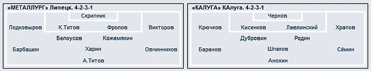 «Калуга»: Чернов, Крючков, Кисенков, Лавлинский, Храпов, Дубровин, Баранов (Соколов, 73), Родин, Шпаков (Петров, 46), Сёмин (Гуров, 65), Анохин (Лосев, 52).