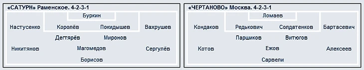 «Сатурн»: Буркин, Настусенко, Королёв, Покидышев, Вахрушев, Дегтярёв, Сергулёв (Злобин, 60), Никитянов, Магомедов (Шанин, 77), Миронов, Борисов (Зубков, 46).