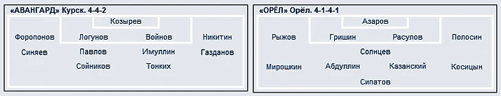 «Орел»: Азаров, Рыжов, Гришин, Расулов, Полосин, Солнцев, Мирошкин, Абдуллин, Казанский (Ручкин, 72), Косицин (Вознесенский, 75), Сипатов (Николаев, 90+).
