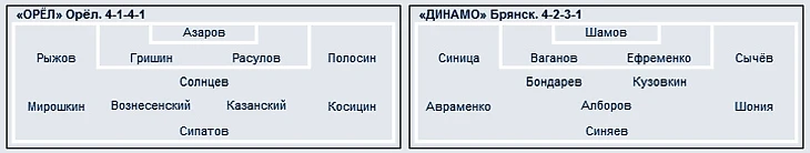 «Орёл»: Азаров, Рыжов, Гришин, Расулов, Полосин (Васюков, 64), Солнцев, Мирошкин (Родионов, 46),