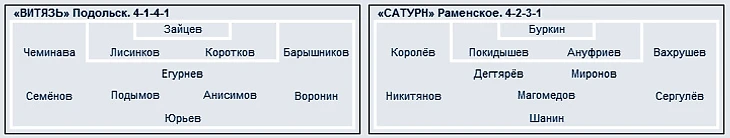 «Витязь»: Зайцев, Лисинков, Чеминава, Егурнев, Воронин (Сопин, 38), Семенов (Баев, 61), Анисимов, Юрьев, Подымов (Имедадзе, 85), Барышников (Кулешов, 50), Коротков.