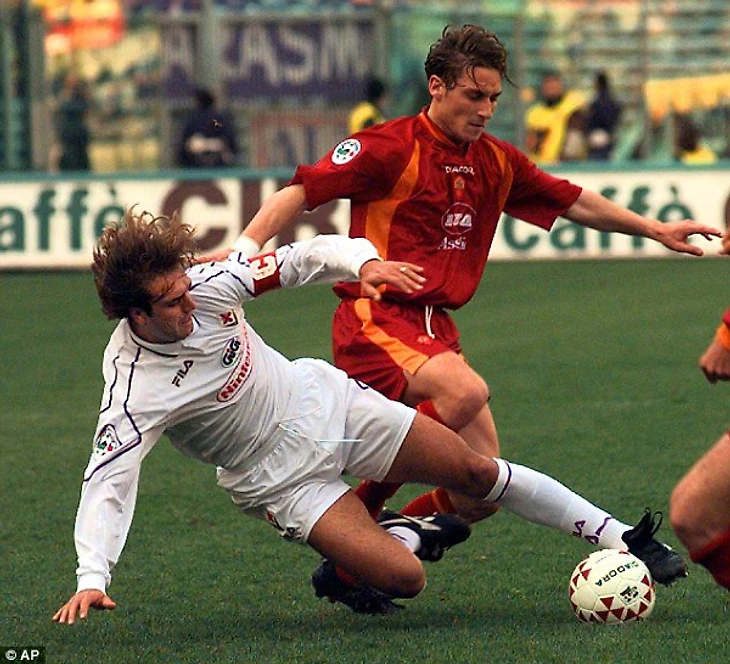 Диковинное зрелище: Батистута выскребает мяч из-под Тотти.