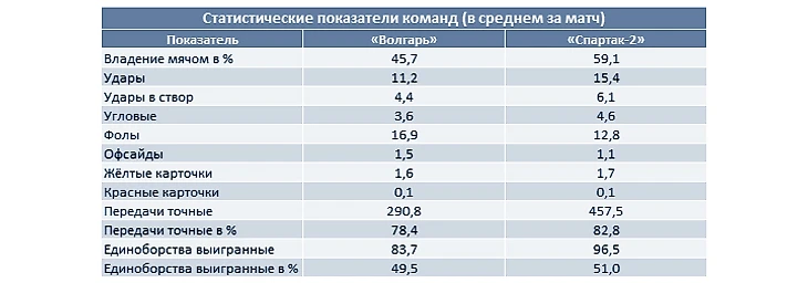 «Спартак-2» много забивает (20 мячей – второй показатель в лиге, уступающий лишь аналогичному показателю «Динамо», забившего на два мяча больше). Семь матчей подряд красно-белые сыграли с тоталом больше 2.5. «Волгарь» сыграл четыре последних тайма с тоталом больше 1.5. Так что, ждём от этой игры высокой результативности.