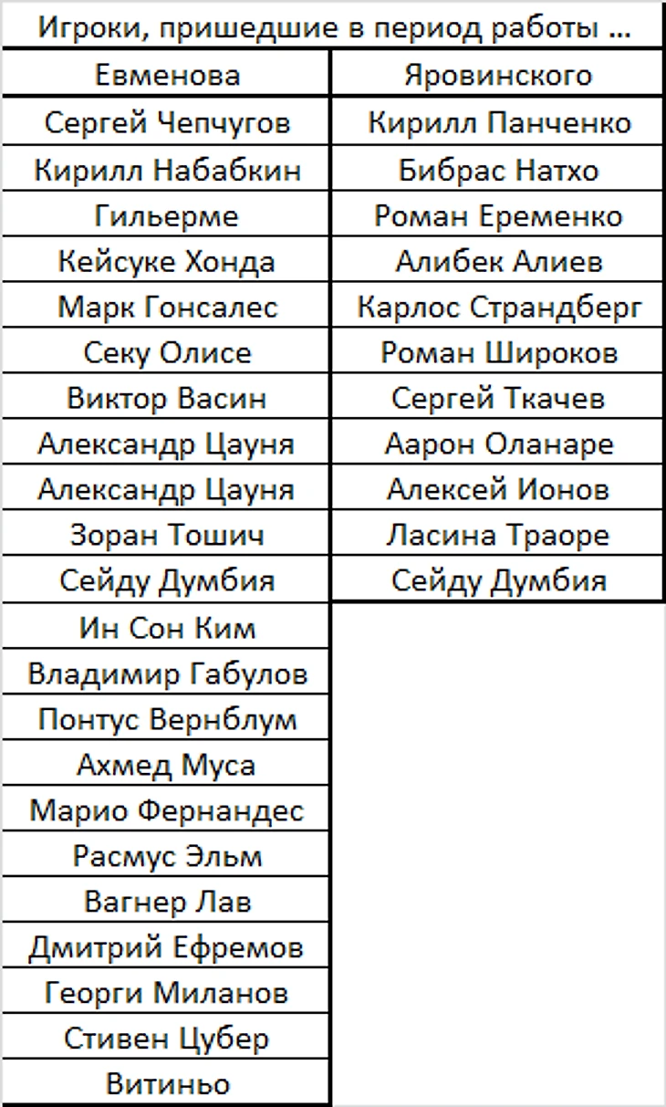 В период Евменова в каждое трансферное окно в среднем ЦСКА пополняло большее количество футболистов, чем в период Яровинского. Соответственно, в первый упомянутый период главному тренеру было проще комплектовать основной состав и скамейку, чем в нынешний период.