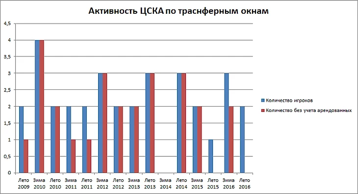 Чтобы разобраться в том, как изменилась работа селекционного отдела ЦСКА был проведен анализ трансферной деятельности красно-синих на рынке с летнего окна 2009 (Евменов пришел в апреле того года) по сегодняшний день. Стоит оговориться, что под периодом Евменова понимается период с лета 2009 года по 25 января 2014, когда он был уволен. При этом, поскольку нет достоверных данных о том, когда Антон стал главой селекционеров, отправной точкой является время его прихода в клуб в качестве простого скаута. С периодом работы Яровинского проще, так как информация о его назначении есть на официальном сайте клуба. Таким образом, период Евменова – 4,5 года или 9 трансферных окон, а период работы Яровинского – 2,5 года или 5 трансферных окон.