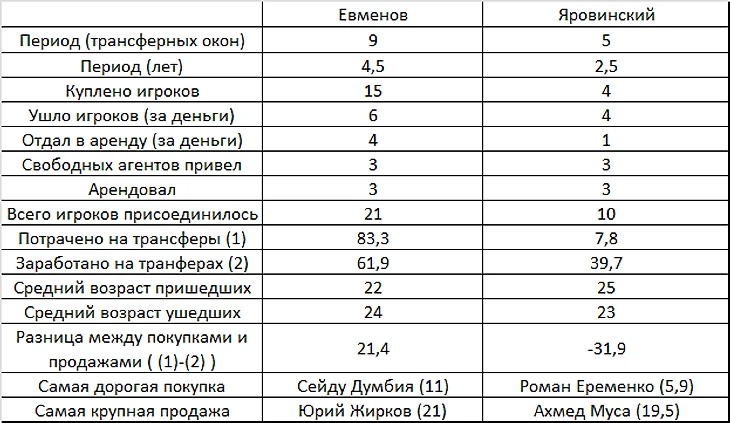 Если же рассмотреть сальдо трансферного баланса (разницу между покупками и продажами футболистов с учетом арендных сделок), то окажется, что при Евменове это сальдо было отрицательным (покупки на 21,4 миллиона евро превысили продажи), а при Яровинском положительным (продажи превысили покупки на 31,9 миллион евро). Если убрать доходы и расходы от аренд, то при Евменове расходы превысили доходы на 28,7 миллионов, а при Яровинском доходы превысили расходы на 30,7 миллионов евро. Таким образом, при Олеге Яровинском трансферная активность была эффективнее в экономическом плане.
