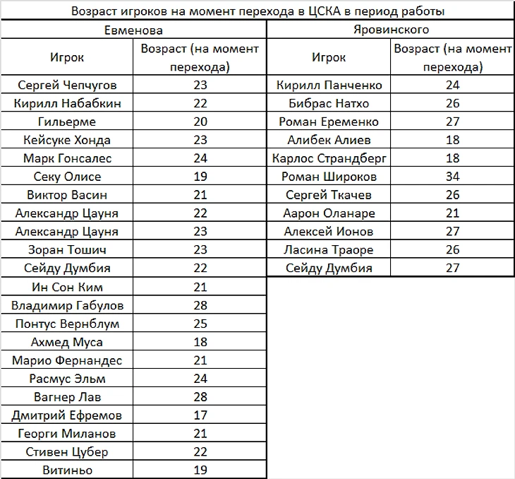 Изменилась и сама методика работы селекционного отдела. К примеру, средний возраст приглашаемых футболистов, включая арендованных игроков, во время работы Евменова был 22 года. При Яровинском средний возраст вырос до 25 лет (если не учитывать Романа Широкова, то до 24). Самым возрастным при Евменове были арендованный Владимир Габулов и вернувшийся в Россию во второй раз Вагнер Лав (по 28). Что также интересно, так это то, что процентная составляющая игроков, приглашенных в ЦСКА до 20 лет сильно не изменилась. При Евменове пришли Олисе (19), Муса (18), Ефремов (17) и Витиньо (19), при Яровинском – Алиев (18) и Страндберг (18). В обоих случаях доля молодых футболистов чуть меньше 20%. Однако доля возрастных футболистов сильно изменилась. В период Евменова к ЦСКА присоединились только 3 футболиста старше 24 лет (упомянутые Габулов и Вагнер, а также 25-летний Понтус Вернблум), таким образом, пропорция возрастных футболистов в общей массе равна 14%. При Яровинском к ЦСКА присоединились 7 игроков старше 24 лет (Натхо (26), Еременко (27), Широков (34), Ткачев (26), Ионов (27), Траоре (26) и вернувшийся в ЦСКА на полгода Думбия (27) ). Это 64% всех пришедших при Яровинском футболистов. Когда-то в ЦСКА гордились тем, что не приглашают игроков старше определенного возраста, однако нехватка ресурсов заставила изменить точку зрения руководства.