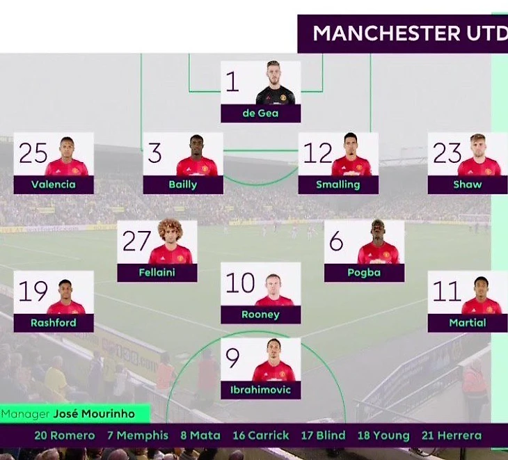 По сравнению с игрой против Манчестер Сити в составе произошло сразу три изменения. Блинд уступил место Смоллингу, а на флангах атаки расположились Марсьяль и Рэшфорд, которого наконец-то поставили в старте. К слову, неудачно сыгравшие на флангах в прошлом туре Мхитарян и Лингард в заявку вовсе не попали. Однако про Мхитаряна прошла информация об усугублении травмы, полученной еще при отъезде в сборную Армении.