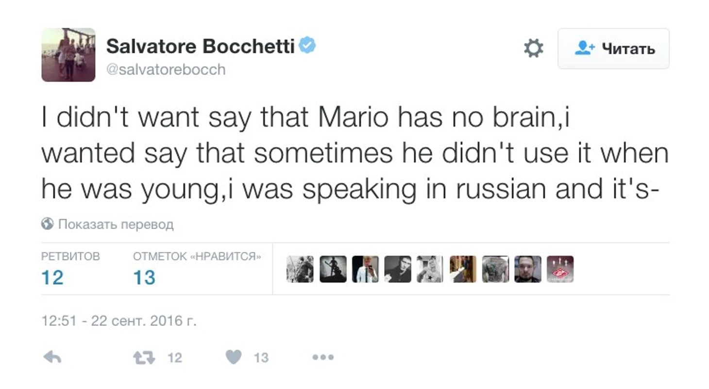 Во время эфира Сальво написал в твиттере, что его не так поняли: на самом деле он очень уважает Марио и желает ему успехов.