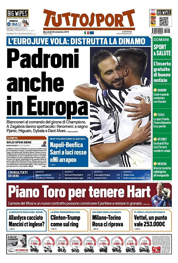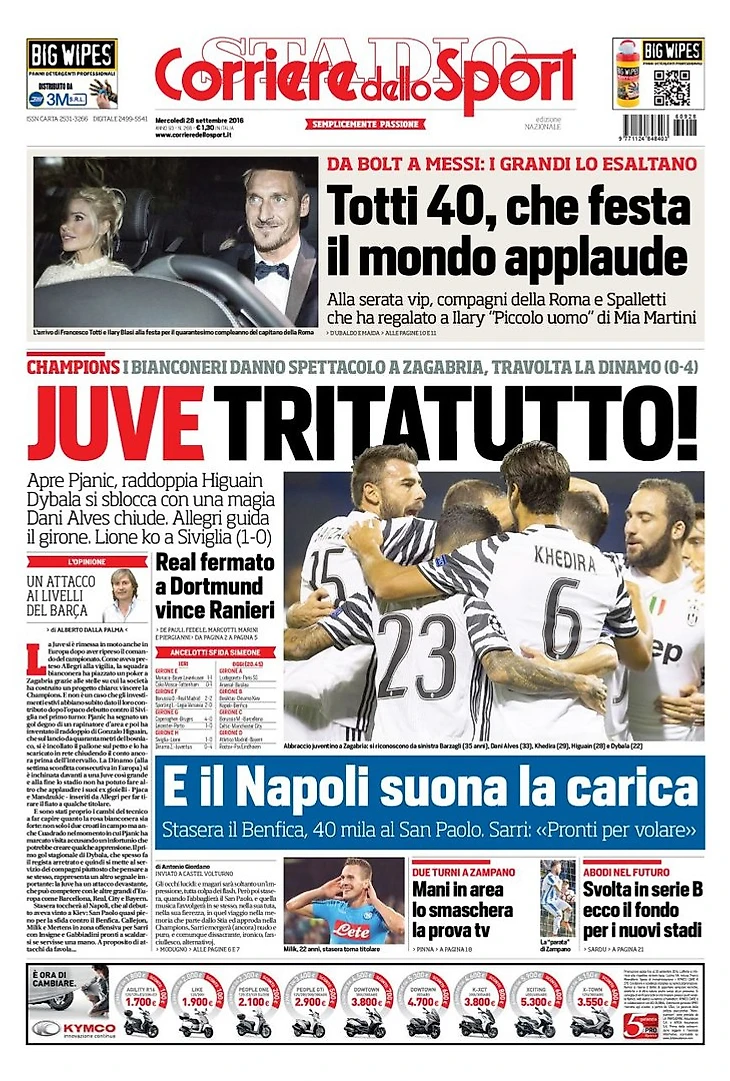 «Мясорубка «Юве»!». Заголовки Gazzetta, TuttoSport и Corriere за 28 сентября