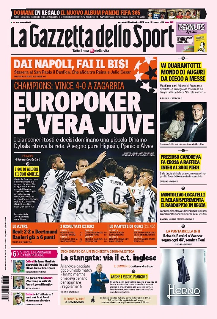 Лига Чемпионов: Бьянконери дали представление в Загребе, повержено «Динамо» (0:4). Открыл счёт Пьянич, удвоил Игуаин. Дибала с волшебством разблокировал свой голевой счёт, Дани Алвес всё завершил. Аллегри возглавил группу. «Лион» потерпел поражение в Севилье (1:0).