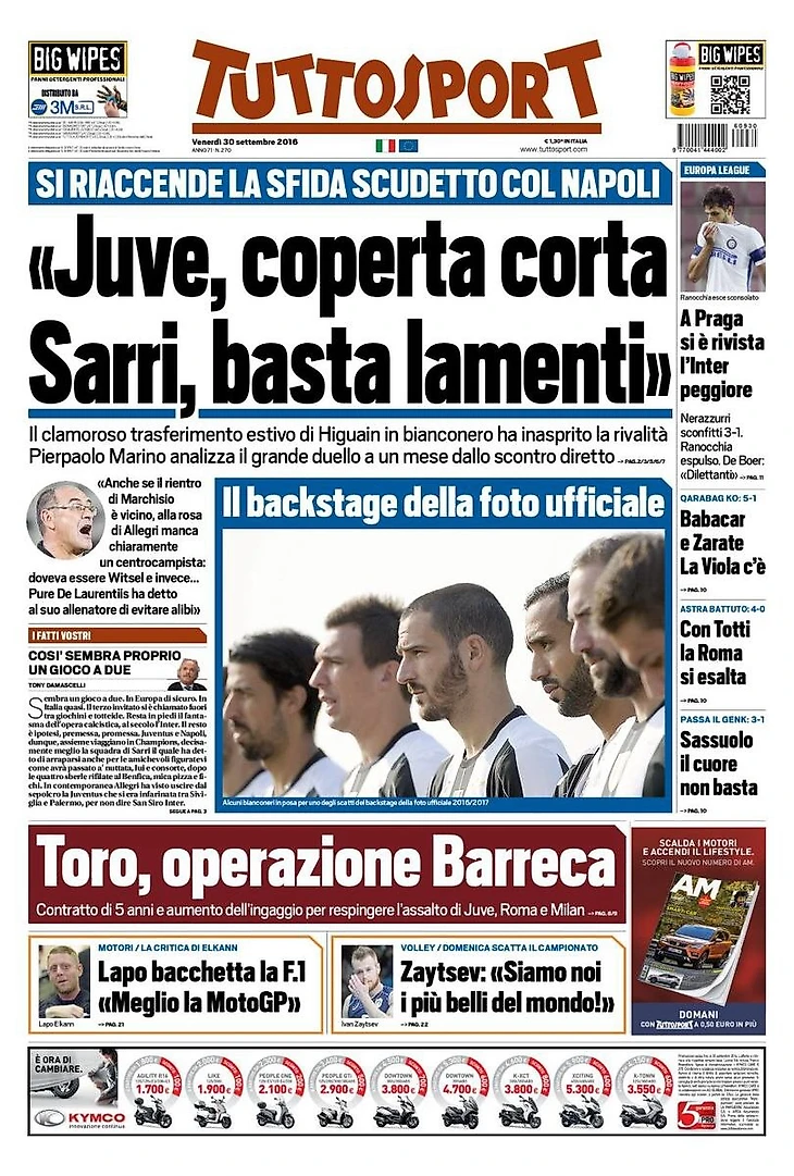 Снова начинается битва за Скудетто с «Наполи». Невероятный летний переход Игуаина к Бьянконери ужесточил соперничество. Пьерпаоло Марино анализирует большую дуэль за месяц до личной встречи. «Даже если Маркизио скоро восстановится, в команде Аллегри очевидно отсутствует полузащитник: должен был быть Витсель и между тем… Даже Де Лаурентис сказал своему тренеру избавиться от оправданий».