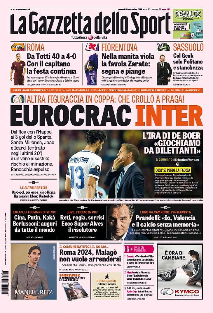 Лига Европы, ещё одно поражение: коллапс в Праге, Де Бур на последнем месте (3:1). Свет «Ромы», пятерня «фиалок». Тотти творит, повержена «Астра» (4:0). Шоу «Фиорентины» (5:1). «Сассуоло» проиграл (3:1).