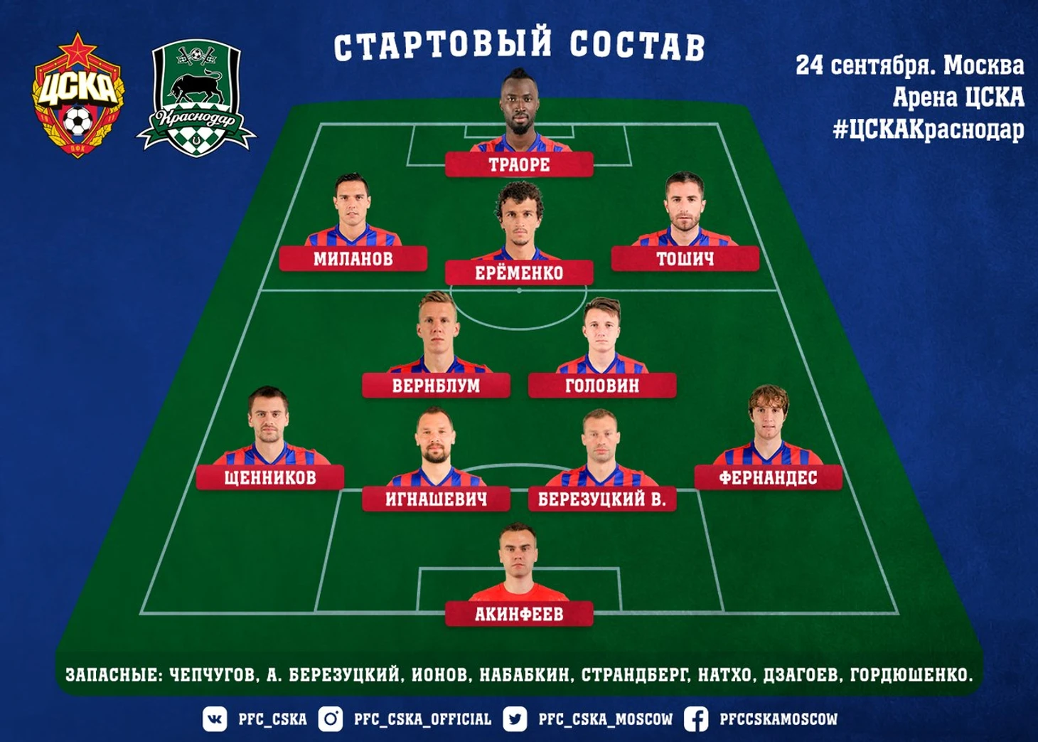 ЦСКА: Акинфеев, Щенников, Игнашевич, В. Березуцкий, Фернандес, Вернблум, Головин, Миланов, Ерёменко, Тошич, Траоре.