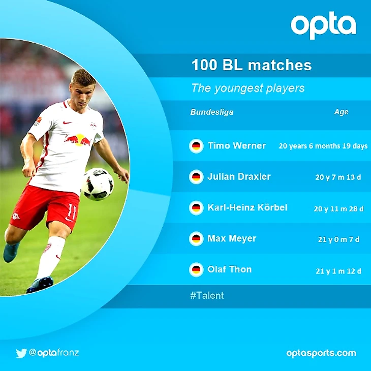 Тимо Вернер стал самым юным игроком, проведшим 100 матчей в первой Бундеслиге (20 лет и 203 дня).