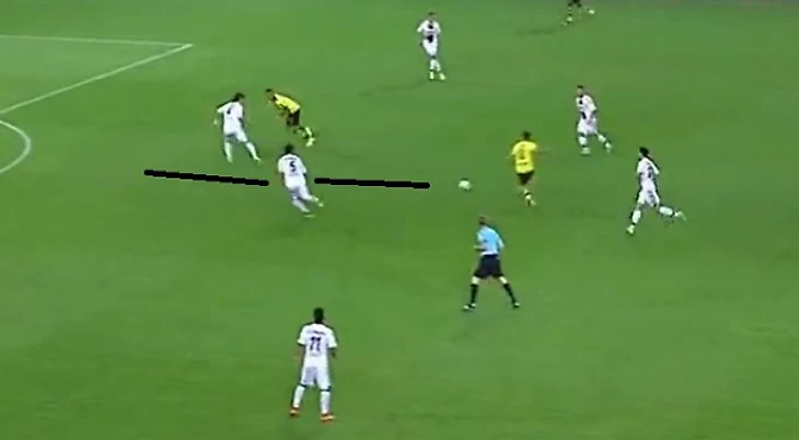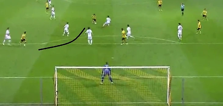 Приняв мяч в свободной зоне, Гетце не пытается обыгрывать, а делает пас между двумя защитниками
